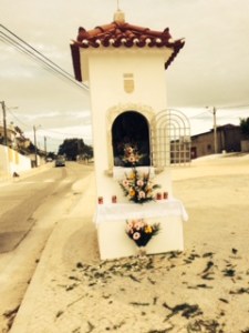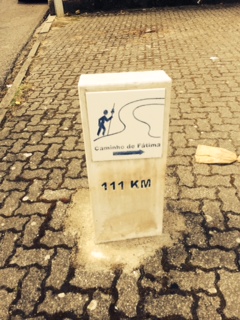 This way mark was atop a boxlike structure in a clearing in a wooded area shortly before descending into one urban town or another. The Way at this point is shared by the Camino de Santiago and the pilgrimage to Fatima. The pilgrimages head in opposite directions through most of Portugal, though they share the same trails. The Fatima way marks are painted in blue; the Camino’s in yellow. This way mark is composed of two hiking shoes pointed in opposite directions – one in blue, pointed toward Fatima, and one in yellow, pointed toward Santiago.